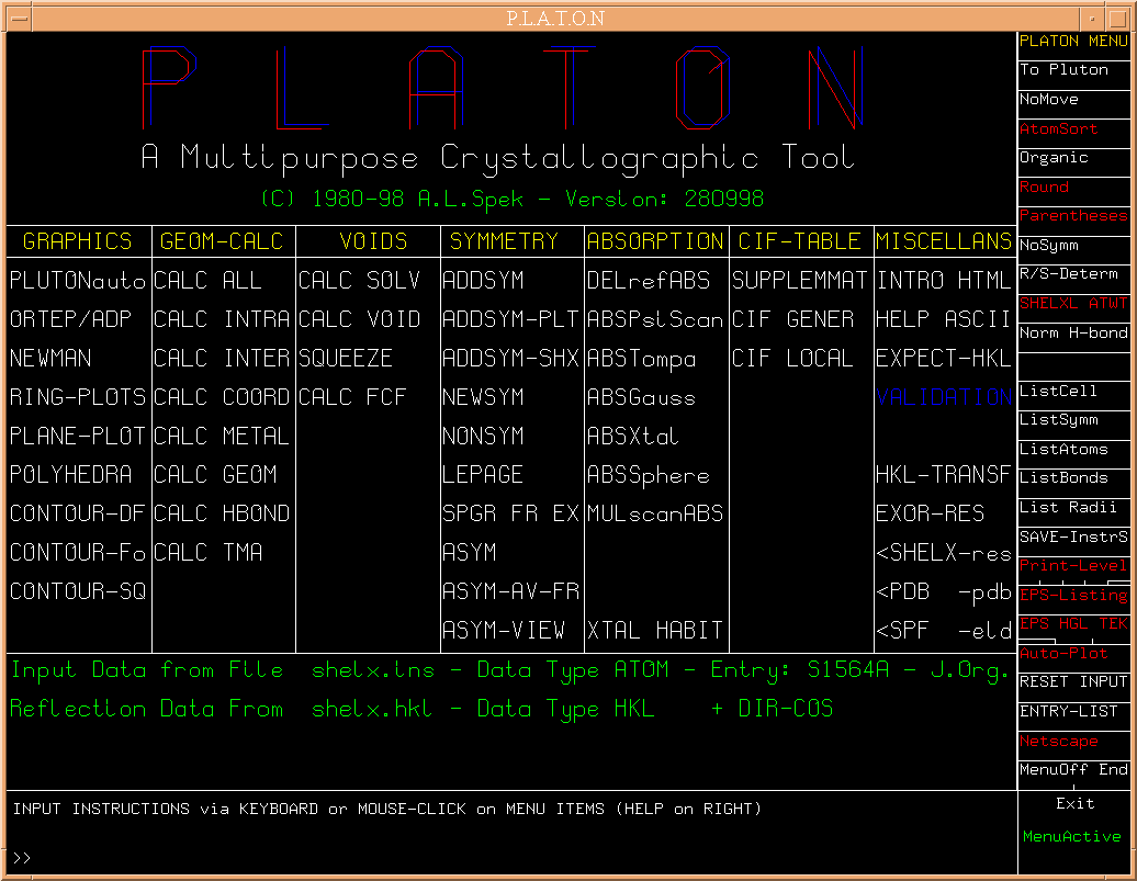 Invoking PLATON with 'platon shelx.ins' will bring up the PLATON OPENING