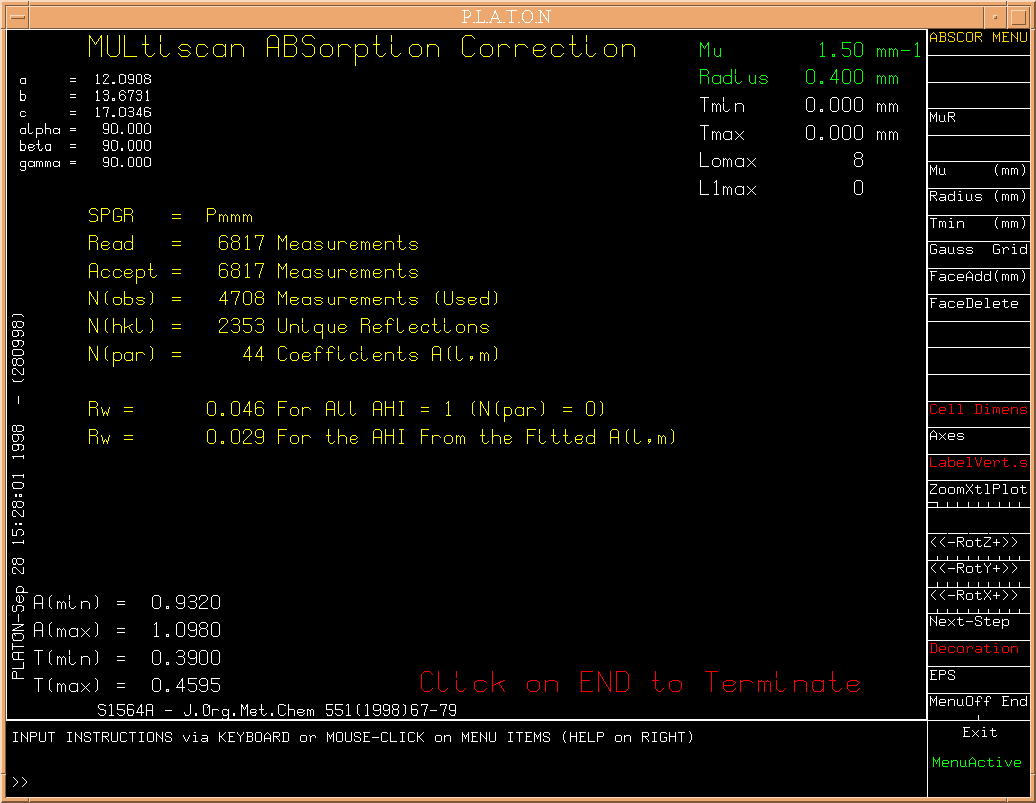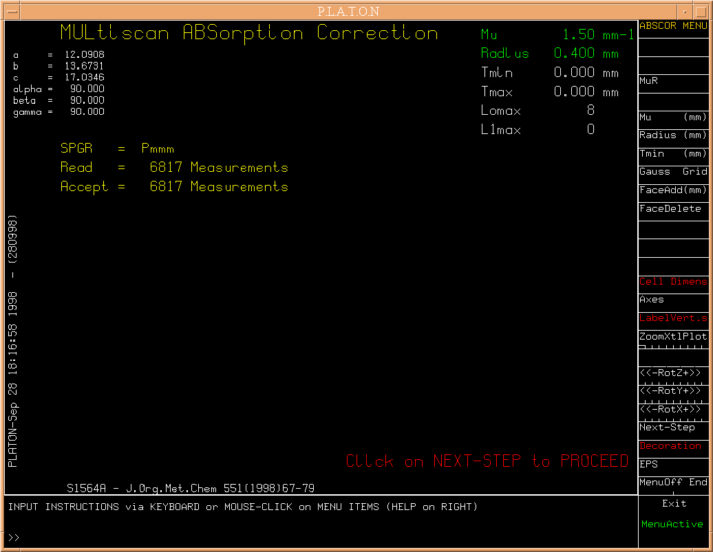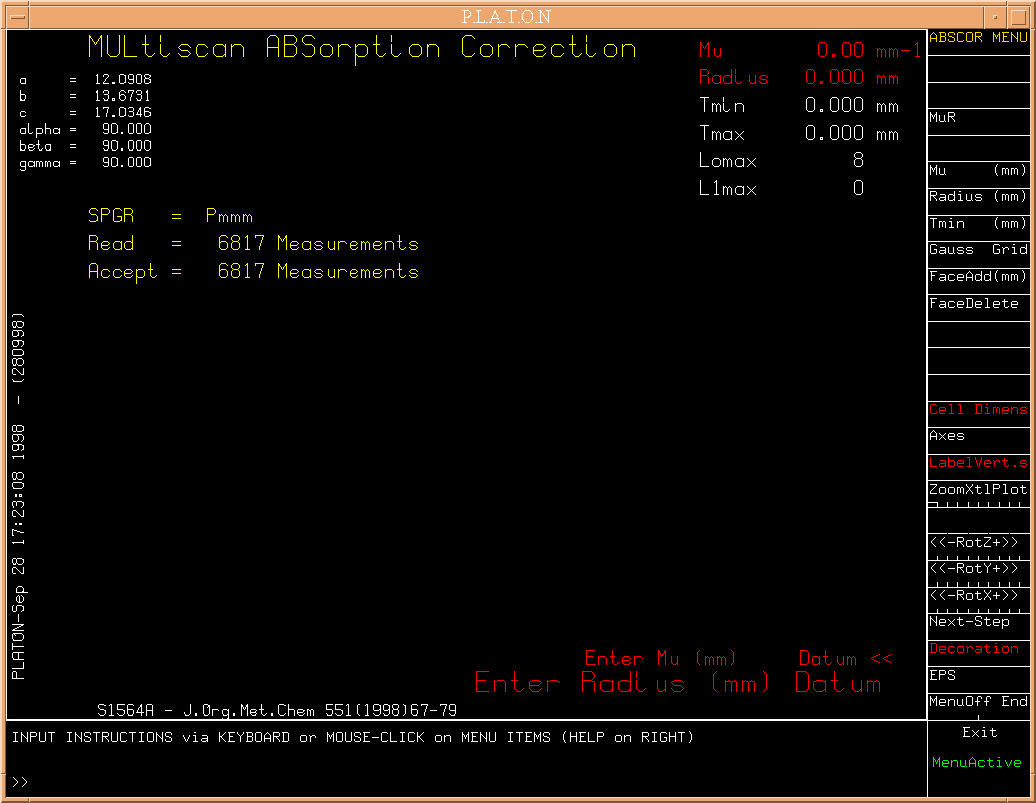 In general, MULABS will be run as a filter, without any further interaction. However, when the input file does not contain any instructions on the type of absorption correction to be applied or insufficient data, a graphics window/menu will come up.