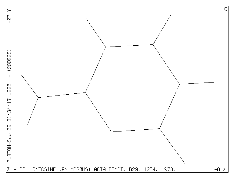 When we now type in respons to the prompt the instruction PLOT, the program will automatically assemble a unique molecule (i.e. symmetry operations will be applied when necessary to find connected sets of atoms), find all bonds and generate a minimum overlap stick-style plot of the structure (Fig. 1), optionally followed by a bell signal on completion of the plot. The program now waits for the user to press the RETURN (or ENTER) key to present the prompt >> again and to accept new instructions. Alternatively, a new instruction may be typed directly without waiting for the prompt.