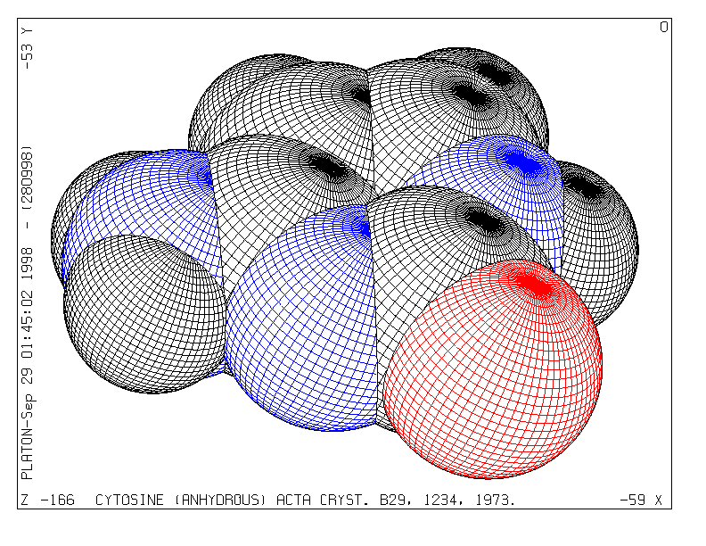 At this point the automatic minimum overlap view direction may be modified with any of the available VIEW instructions. As an example we can rotate the structure clockwise by 45 degrees about the horizontal X-axis with the instruction VIEW CURRENT XROT 45 (or to the same effect XROT 45) and see the effect with a new PLOT instruction. The style of the plot may be changed into the SOLID, STRAW, ROD or CPK style with corresponding instructions: e.g. ROD SHADE COLOR followed by PLOT ( Fig. 2) or CPK GLOBE COLOR followed by PLOT (Fig. 3).
